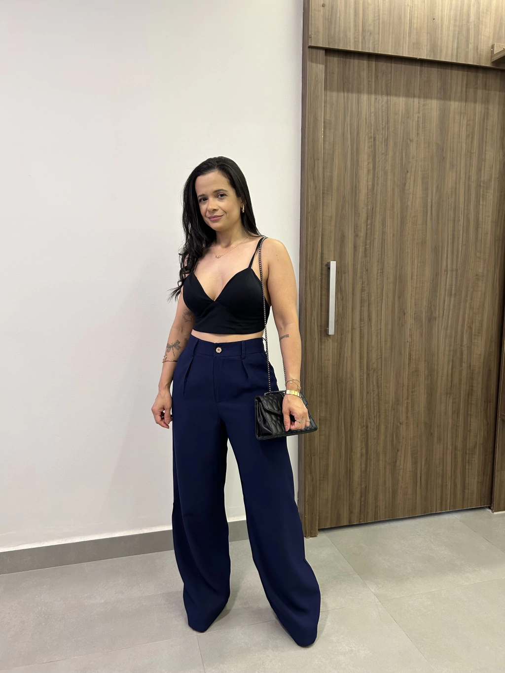 Calça Alfaiataria Blue: sofisticação em cada detalhe. Confeccionada em viscose sarjada de alta qualidade, apresenta corte pantalona clássico, com pregas frontais que valorizam a silhueta. O azul marinho elegante ganha acabamento refinado com zíper frontal, botão com detalhe amadeirado e passantes para cinto. Bolsos faca laterais completam o design clean, sem bolso atrás. Perfeita para composições formais ou casuais com requinte.
